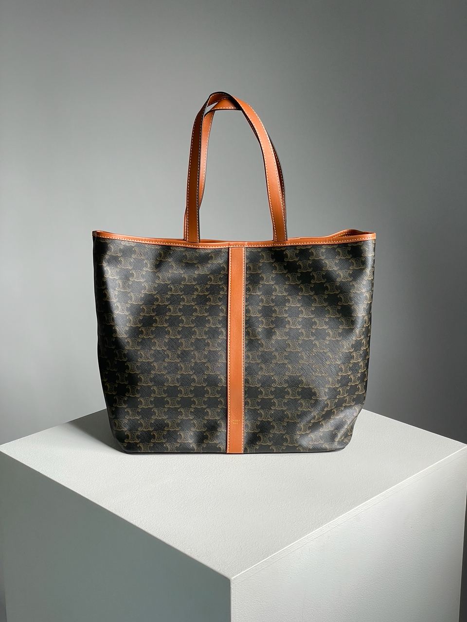 Розмір 45x31x17смСумка виготовлена з гладкої шкіри з фірмовою канвою.Всередині одне велике відділення та невеличка кишеня.Підкладка у сумки з щільного та якісного текстилю.Зачиняється відділення на заклепці.