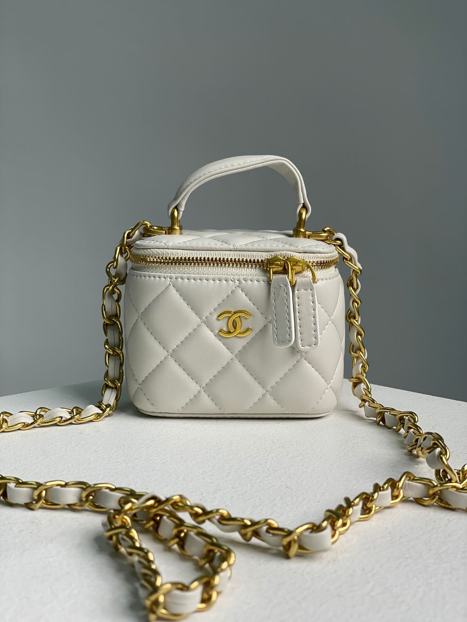 Розмір 11х10х7смСумка виготовлена з гладкої шкіри, має ромбоподібну прострочку.Всередині одне невеличке відділення, є ще менший кармашок.Зачиняється на застібці.Підкладка з щільного текстилю.Для носіння у руці є невеличка ручка, а через плече - є довгий тоненький ланцюжок з вплетеною шкірою (не відстібається).Комплектується у фірмовій коробці на магнітах та пильовику.