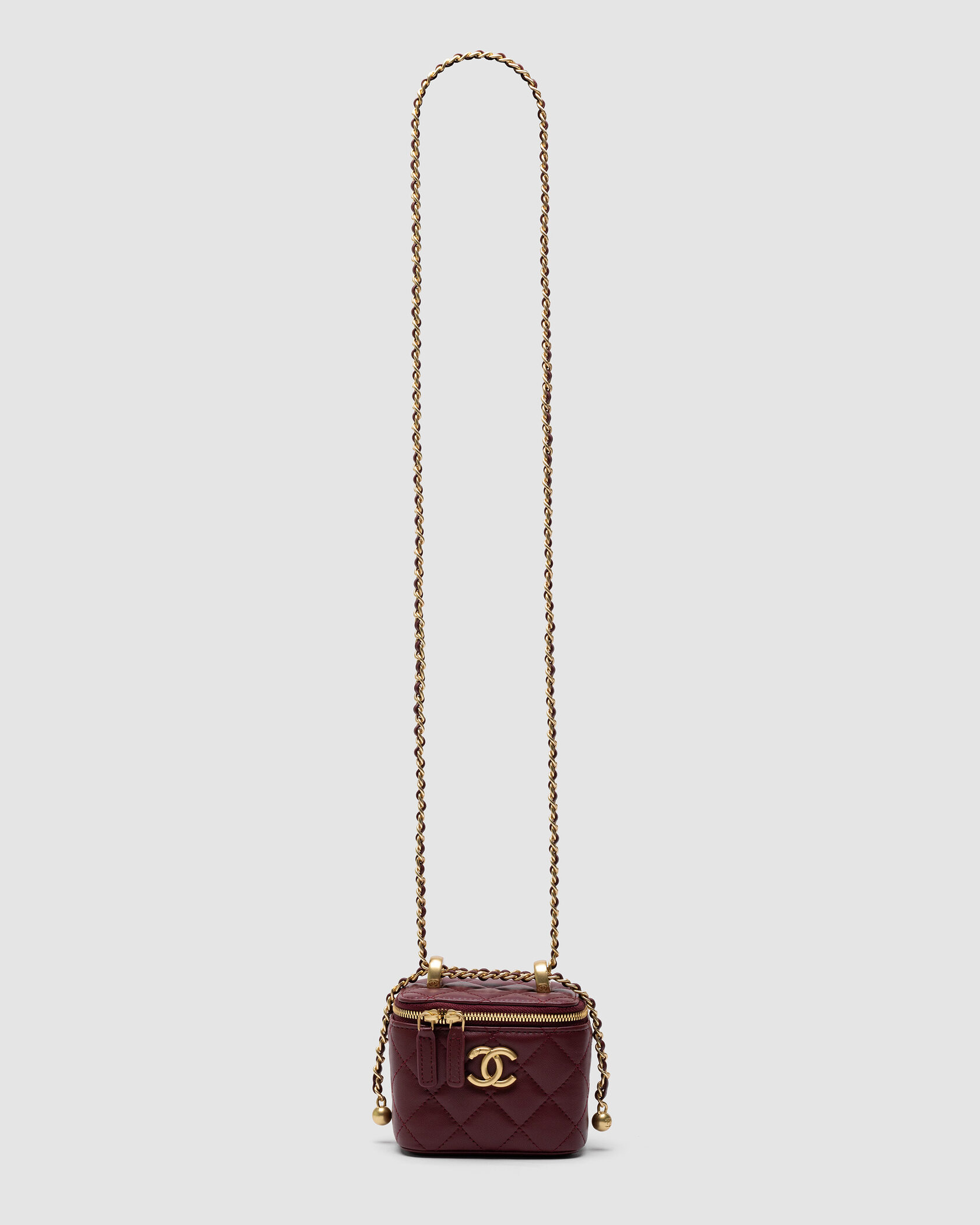Розмір 11х10х7смСумка виготовлена з гладкої шкіри, має ромбоподібну прострочку.Всередині одне невеличке відділення, є ще менший кармашок.Зачиняється на застібці.Підкладка з щільного текстилю.Для носіння через плече є ланцюжок з вплетеною шкірою, довжина регулюється завдяки оригінальному механізму.Комплектується у фірмовій коробці на магнітах та пильовику.