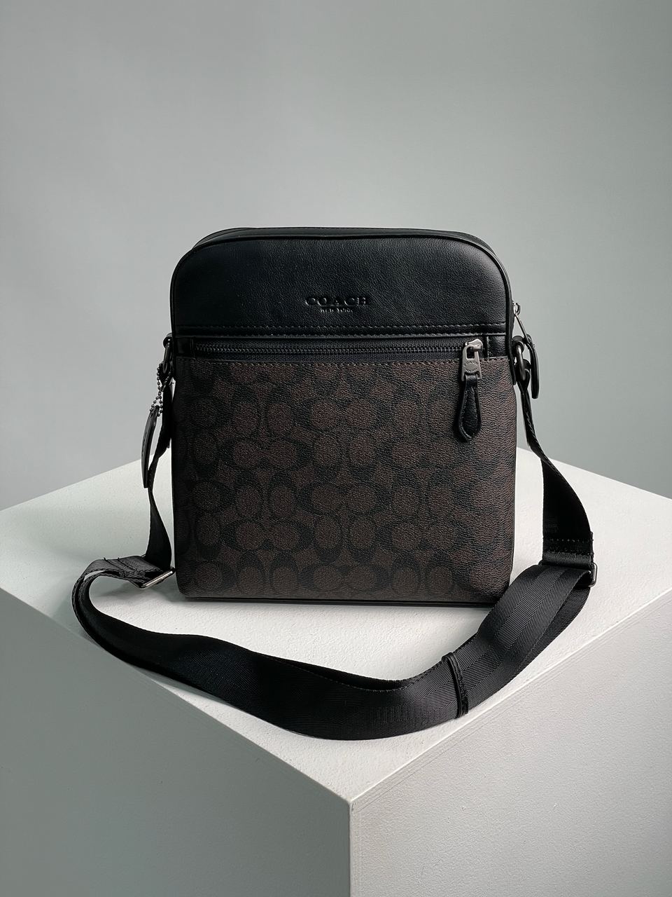 Розмір 23.5х26.5х5смСумка виготовлена з гладкої шкіри з фірмовою канвою.Всередині одне велике відділення, також є кишеня на застібці з шкіряною брендовою нашивкою.Підкладка з щільного брендового текстилю.Фурнітура якісна, металева та брендована.Ремінець з щільного текстилю чорного кольору, має регулюєму довжину.
