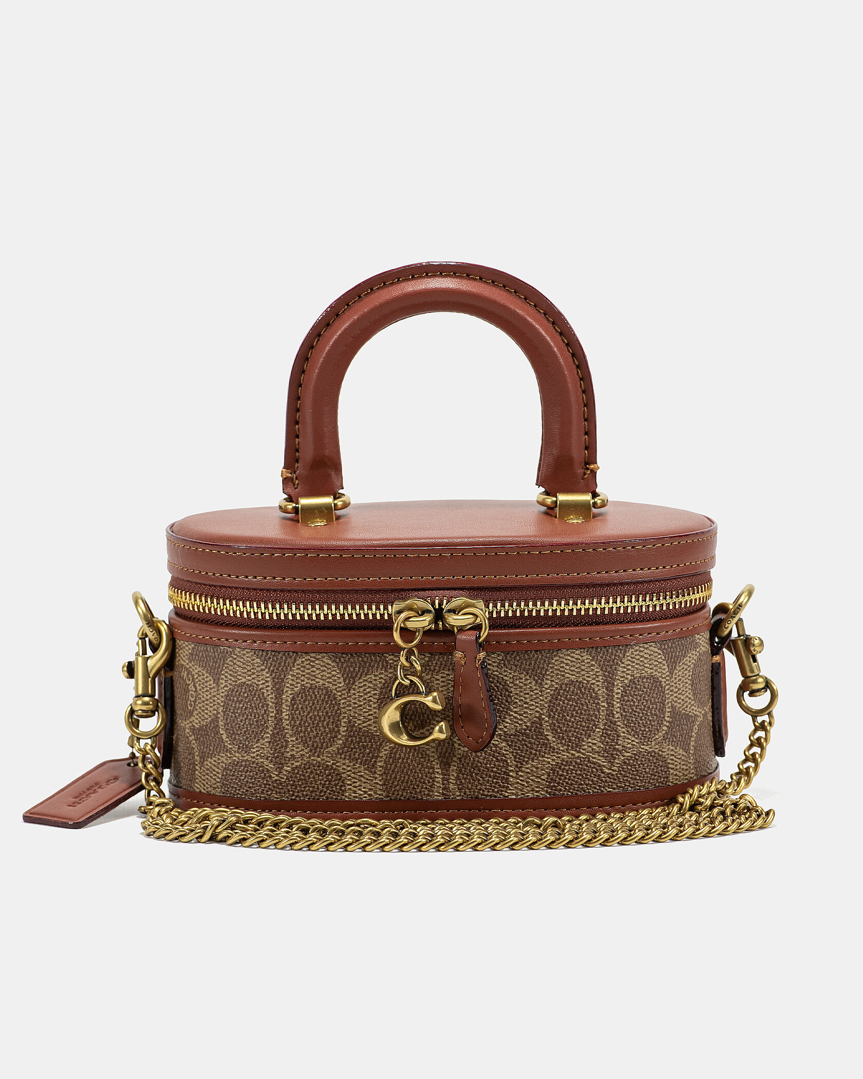 Розмір 17х8х5смМатеріал: Фірмовий текстиль + натуральна шкіраФурнітура: Бронзова, фірмовий брелок CoachЗакриття: БлискавкаВідділення: Одне основне відділення без перегородокРемінь: Верхня шкіряна ручка + ланцюжок через плече (в комплекті)Стиль: Унікальна компактна модель у формі шкатулки — елегантний акцент до будь-якого образу. Легка, зручна та трендова.