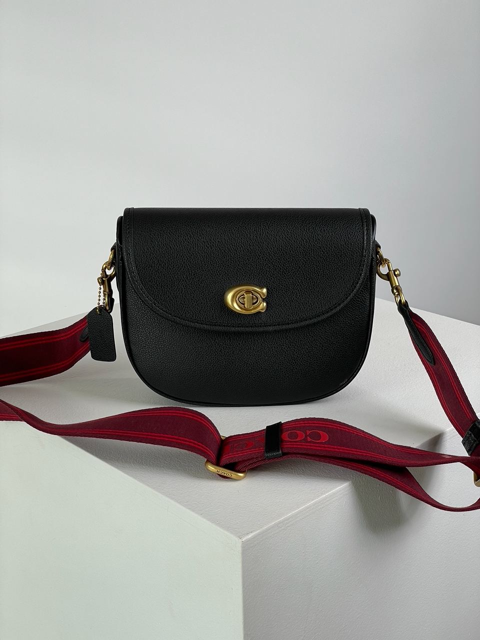 Розмір 22x18х7смСумка виготовлена з зернистої шкіри чорного кольору.Всередині одне велике відділення та маленьке вузьке, також є кишеня на застібці.Підкладка у сумки з ворсистої шкіри бордового кольору, є фірмова нашивка з тисненням.Якісна фурнітура з усіма брендовими написами.Червоний широкий ремінець має брендові написи та регулюєтся по довжині.Комплектується у брендованій коробці та пильовику.