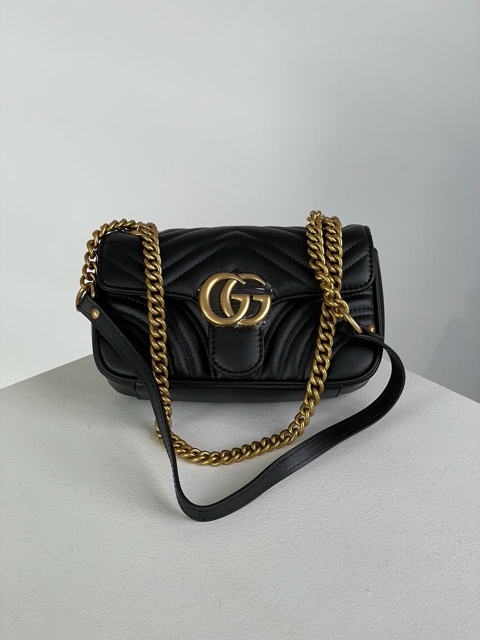 Розмір 22x13x6.5смСумка виготовлена з гладкої шкіри, прострочена.Всередині одне відділення, також є кишеня з шкіряною нашивкою.Підкладка у сумки з оксамитового текстилю.Зачиняється відділення на оригінальному механізмі.Якісна фурнітура, металева та брендована.Золотистий ланцюжок має фіксовану довжину зі шкіряною ручкою, регулюється як для носіння у руці так і через плече.Комплектується в фірмовій коробці та пильовику, є буклетики.