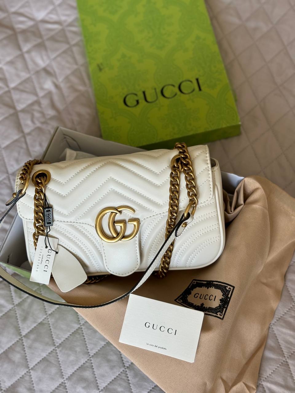 Розмір 22x13x6.5 смМатеріал: шкіраОдин відділ, маленька кишеняРемінець 90 смЛого всерединіВ комплекті: коробка Gucci , пакувальний папір, пильник фірмовий