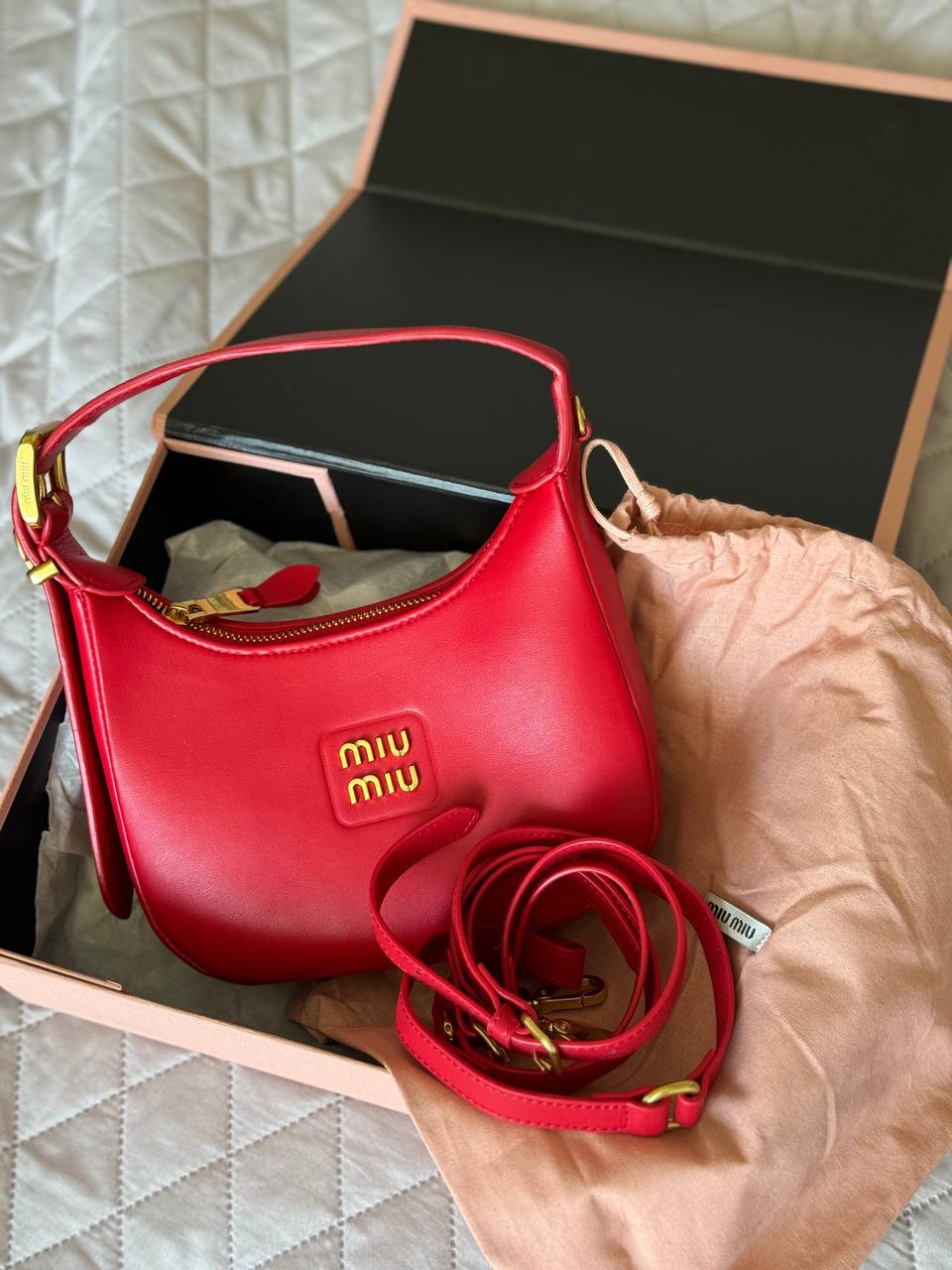 Розмір 21х23х7 смМатеріал: натуральна шкіраОдин відділ, маленька кишеняМеталеве лого всередині Довгий ремінець 95 см максимальна довжина (регулюється)В комплекті: магнітна коробка miu miu, пакувальний папір, пильник фірмовий