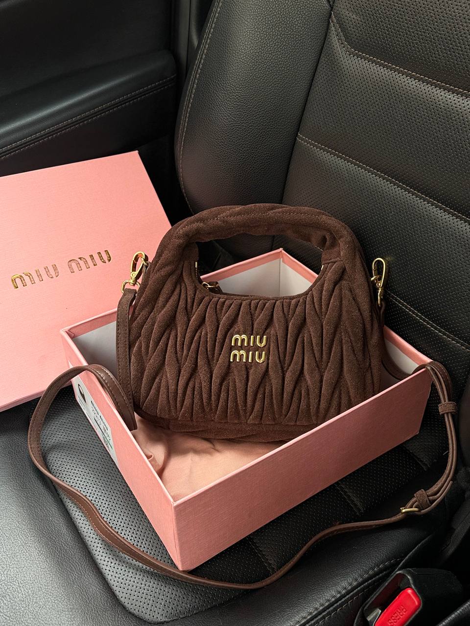 Розмір 21х23х7смМатеріал : замшаОдин відділ, маленька кишеняМеталеве лого всередині Довгий ремінець 95 см максимальна довжина (регулюється)В комплекті: коробка miu miu, пакувальний папір, пильник фірмовий, печиво з передбаченням