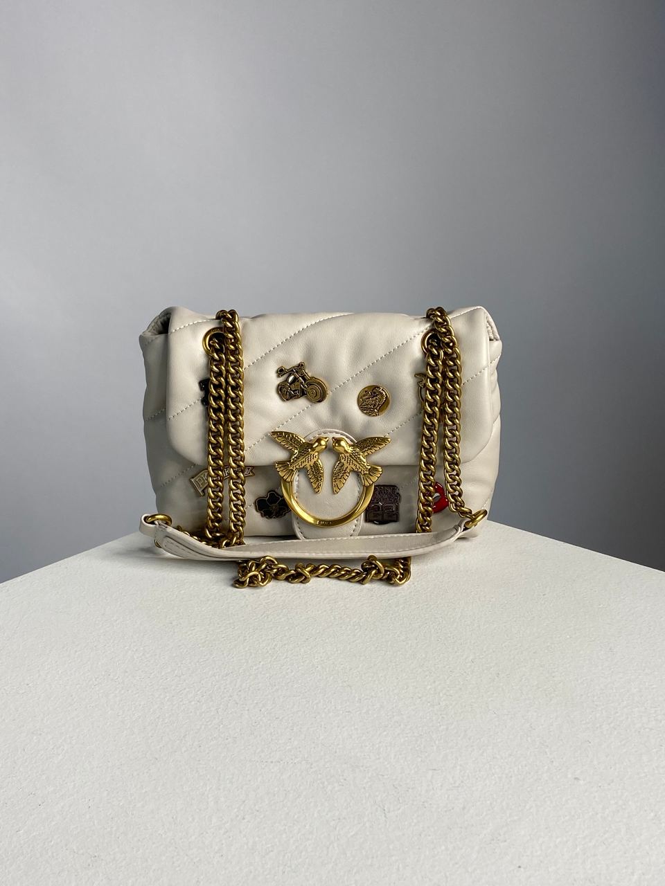Розмір 22х15х9смСумка виготовлена з гладкої та м’якої шкіри, прострочена.Попереду закріплено 8 металевих пінів.Всередині два відділення, поміж ними є кишеня на застібці.Підкладка у сумки з щільного приємного на дотик текстилю.Фурнітура металева, брендована.Ланцюжок золотистий, регулюється як для носіння у руці так і через плече.Ручка у ланцюжка прострочена, з натуральної шкіри.Комплектується у фірмовій коробці, пильовику, пакетику, також є невеликі буклетики.