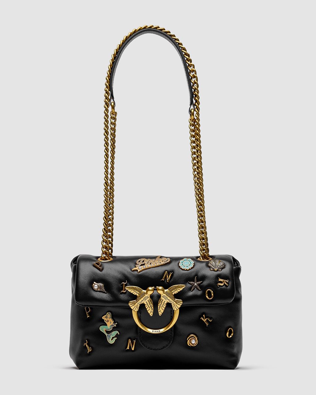 Розмір 22х14х9смСумка виготовлена з гладкої натуральної шкіри, з металевими пінами в морському стилі.Всередині два великих відділення, також є кишеня на застібці.Зачиняється головне відділення на фірмовому механізмі.Підкладка у сумки текстильна, на дотик нагадує замшу.В комплекті є ланцюжок зі шкіряною ручкою, без можливості регулювання довжини.Комплектується у фірмовій коробці та пильовику.