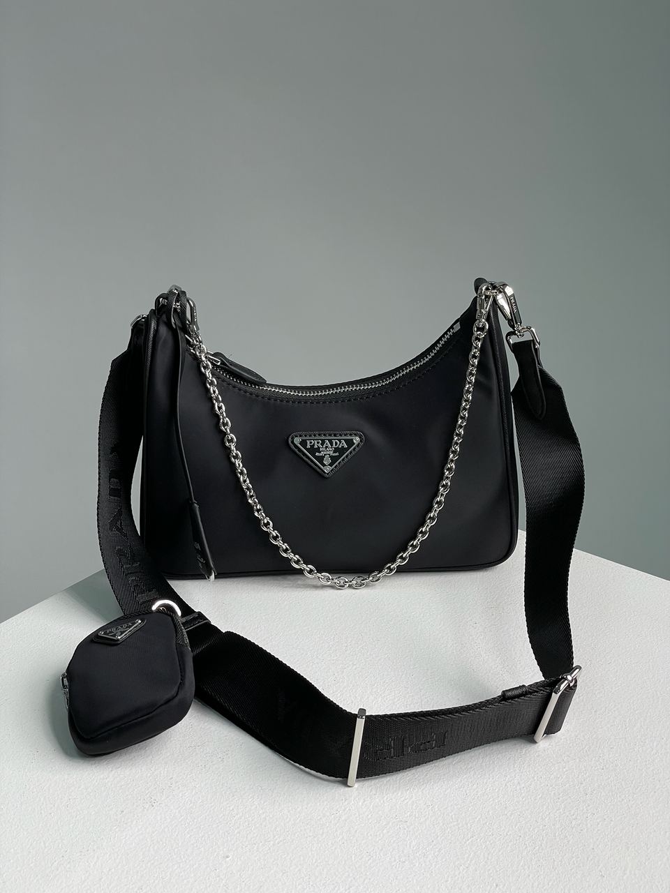 Розмір 24х12х5смСумка виготовлена з нейлону.Всередині одне відділення, є металеве брендове лого.Підкладка з щільного брендованого текстилю.Зачиняється відділення на застібці.В комплекті ланцюжок для носіння у руці та текстильний ремінець на карабінах з регулюємою довжиною.Комплектується у брендованій коробці та пильовику.