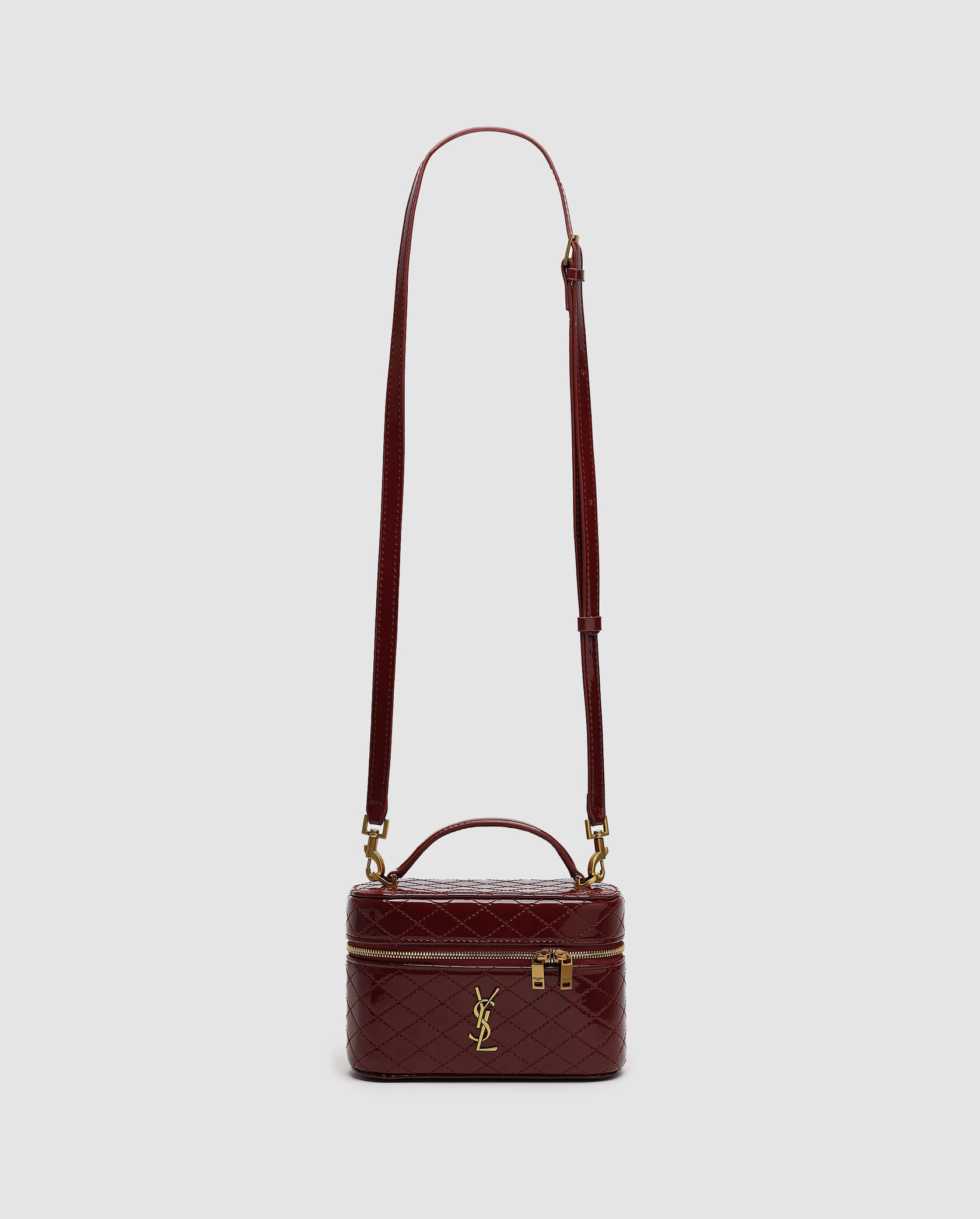 Розмір 18х11х6.5смСумка виготовлена з лакованої шкіри, має ромбоподібне прострочення.Всередині одне велике відділення, є невеличка кишеня з фірмовим тисненням.Підкладка з гладкої шкіри чорного кольору.Зачиняється відділення на застібці.Фурнітура металева та брендована.Ремінець шкіряний, на карабінах, має регулюєму довжину.Комплектується у брендовій коробці на магнітах та пильовику, є буклети.